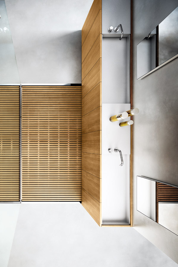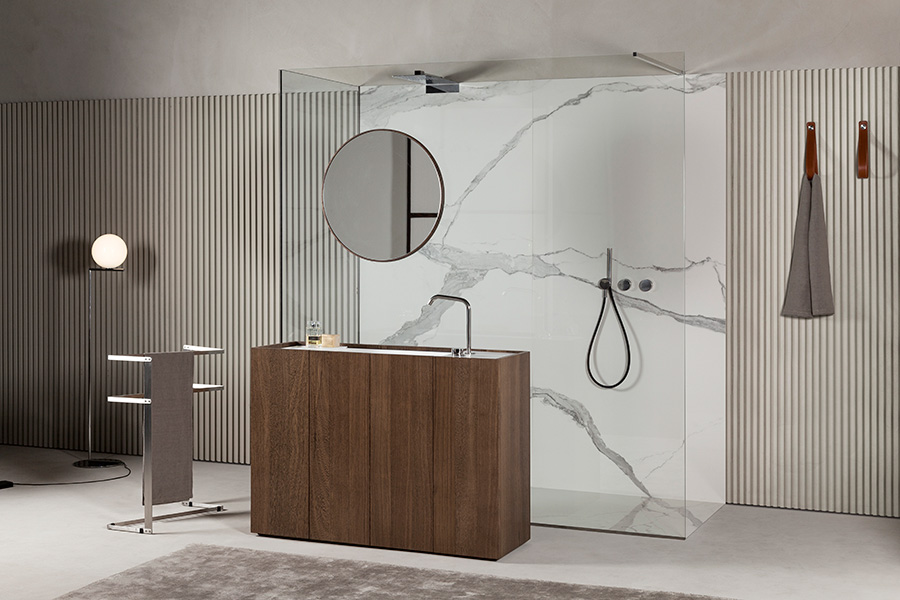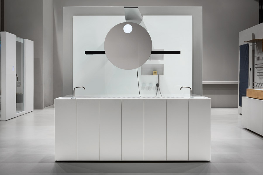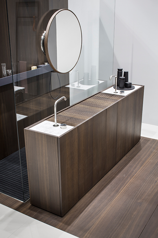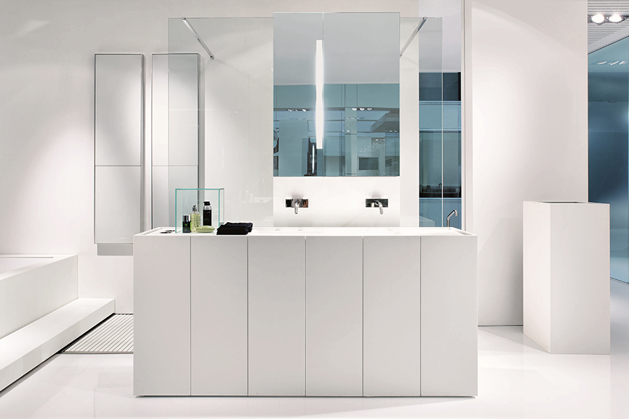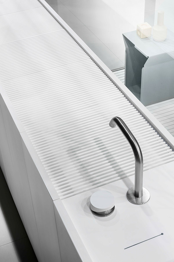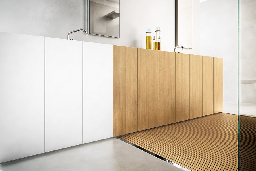 Modulo30 est une collection de meubles sur pied composée de modules de 30 cm intégrant un lavabo pleine longueur en Corian®.